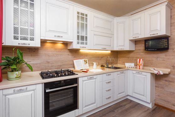 Белые кухни в сочетании с деревом способны украсить комнату, оформленную в практически любом стиле.