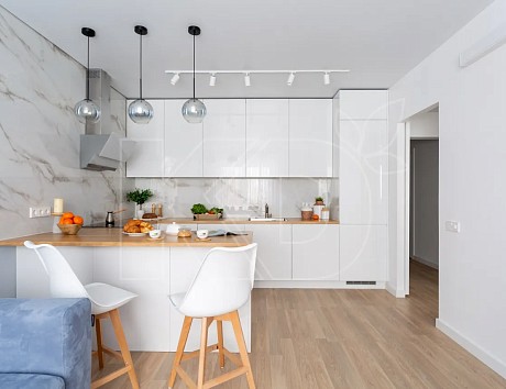 Какие обои добавят изюминку в интерьер с высоким белым гарнитуром