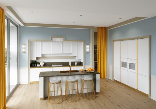 Разнообразие фактур. Белоснежные фасады могут быть матовыми, полуматовыми или глянцевыми. В любом варианте они будут смотреться эффектно и презентабельно.