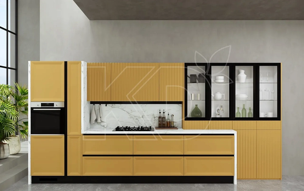 2. Размер. Мебель размещается в больших столовых и поэтому имеет большие размеры. Планировка - П-образная или квадратная, обычно с островом. Кухонные гарнитуры более сложные и часто имеют барную стойку или витражные шкафы. Дешевые модели обычно меньше по размеру и имеют линейную планировку.