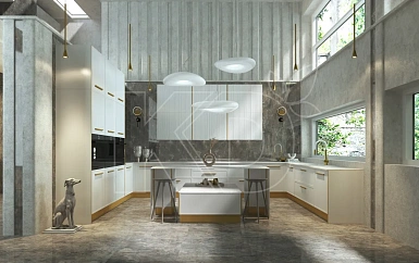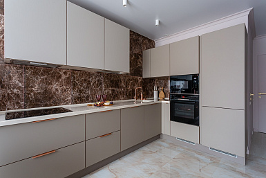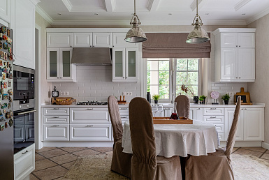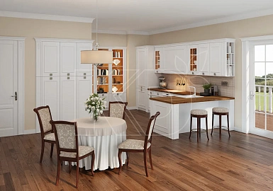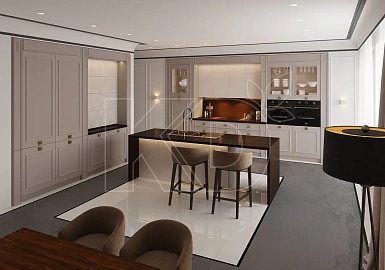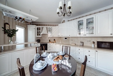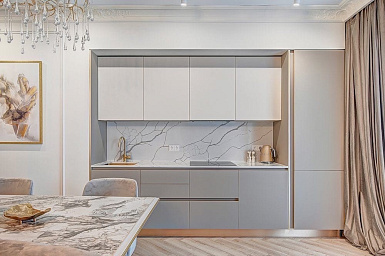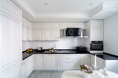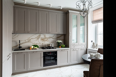 Неоклассика – еще одно направление, которое используется при оформлении кухонных интерьеров в 2023 году. Для этого стиля характерно сочетание современных деталей с классическим дизайном. Так, прямые строгие фасады, благородные спокойные оттенки комбинируются с продуманными системами хранения.