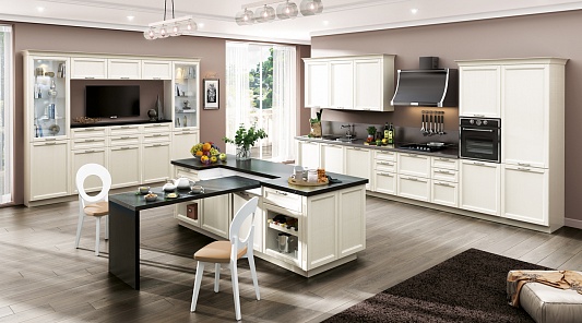 Ясень обладает красивой природной структурой с приятным шелковистым блеском и легко подвергается обработке. Фасады из массива этой породы можно тонировать и окрашивать в различные цвета. Поскольку ясень имеет особую пористую структуру, ему легко придать искусственно состаренный винтажный вид. Декорированные патиной, подобные кухни в классическом стиле выглядят как настоящее произведение искусства.