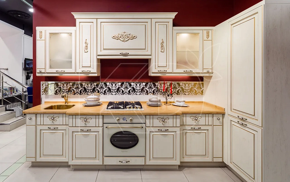 Фасады гарнитура – самая дорогая его часть. Для производства элитных кухонь применяется натуральная древесина дуба, бука и ясеня. Также на итоговую стоимость фасадов влияет наличие декоративной отделки – резьбы, стеклянных вставок, мозаик и других элементов.