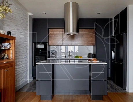 Это два базовых цвета, которые прекрасно друг с другом гармонируют. На сером фоне можно разместить кухонный гарнитур в песочных тонах. Чтобы не переборщить с декором, потолки лучше оставить без отделки, а стены и пол сделать бетонными. Если хочется добавить акцент, то на одной из стен можно сделать кладку из светлого кирпича. Этого будет достаточно.