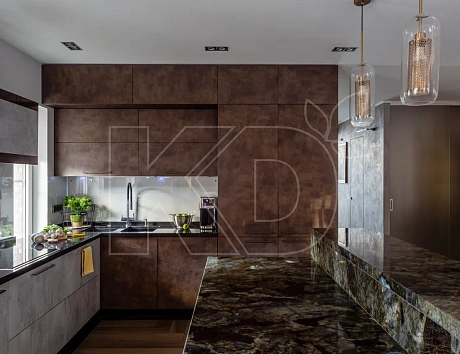 Освежить бежевую мебель поможет черный потолок на кухне. Остальные поверхности могут быть оформлены по-разному. Главное – задействовать светлые оттенки, чтобы уравновесить такое контрастное решение. Стены могут быть бетонными или кирпичными.