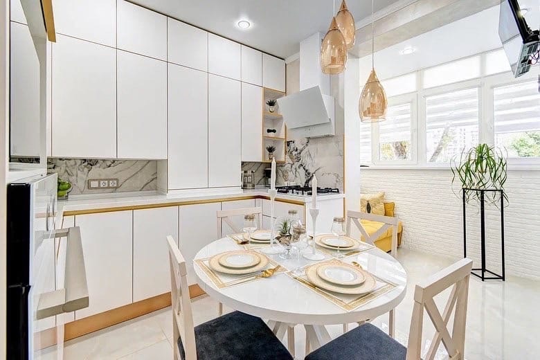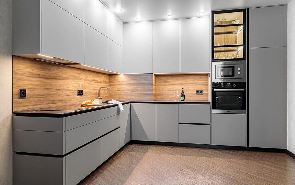 Данное правило в первую очередь касается параллельной и П-образной планировки. Для свободного перемещения между модулями потребуется расстояние 1,2-1,5 метра. В противном случае будет неудобно открывать дверцы шкафов и духовок.