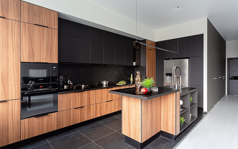 В больших помещениях кухня и гостиная часто оказываются совмещенными. Визуально отделить одну зону от другой можно с помощью островной конструкции, барной стойки или стеллажа. Зонирование с помощью кухни на заказ от производителя технически выполнить гораздо проще. Дело в том, что комплект будет изготовлен с учетом архитектуры пространства.