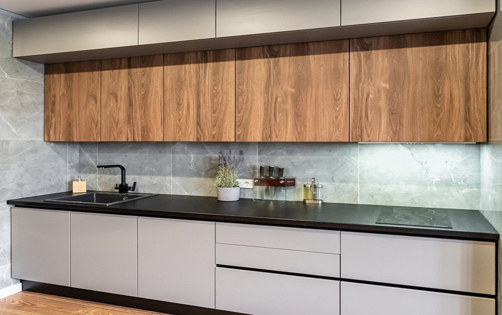 • Линейная. При такой планировке модули расставляют в один ряд возле стены. Это подходящий вариант для небольших комнат, когда важно сохранить каждый сантиметр пространства.