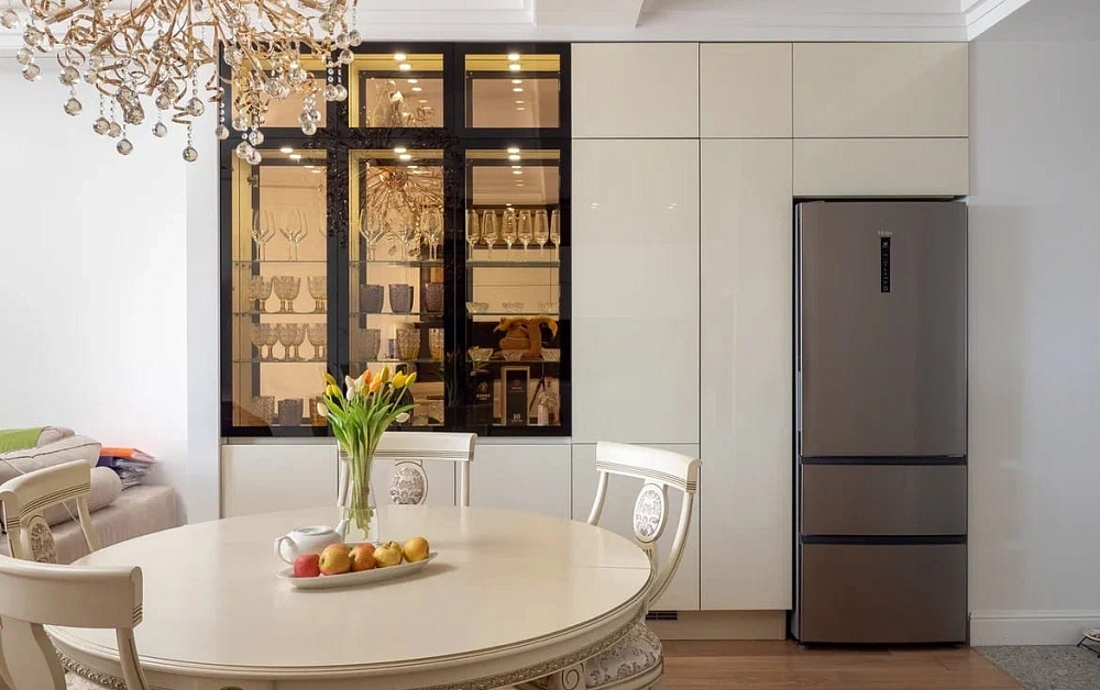 Так, для установки классической кухни потребуется большая площадь. Комплекты в стиле классика отличаются роскошной отделкой в виде позолоты, резьбы, лепнины, патины. Исходя из этого, для оформления стен и потолка следует использовать соответствующие элементы – многоярусные люстры, картины в резных рамах, дорогие обои с теснением и шелкографией. Напольное покрытие может быть каменным, деревянным или из искусственных материалов высокого качества.