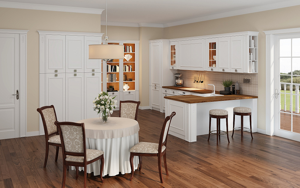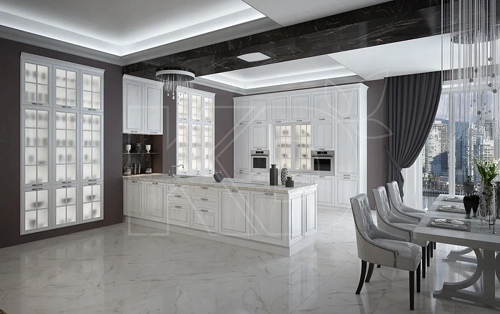 Дизайн кухни в стиле классика привлекает внимание своей роскошью. Для отделки фасадов применяются резные узоры, лепнина, позолота, патина, рамки.