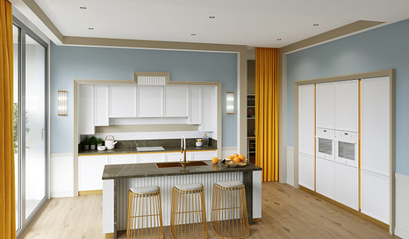 П-образные кухни. Очень удачная планировка для обустройства габаритных помещений. Шкафы такого комплекта занимают место сразу возле трех стен. На центральной столешнице обычно устанавливают раковину, а у боковых стен располагают варочную панель и холодильную камеру. Такая расстановка позволяет готовить с комфортом даже большой компанией.