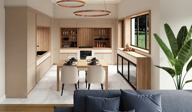 Массив для гарнитура выбирают, если хозяева не собираются часто заниматься ремонтами, мечтают о создании респектабельного интерьера, отдают предпочтение экологичным технологиям и природным материалам.