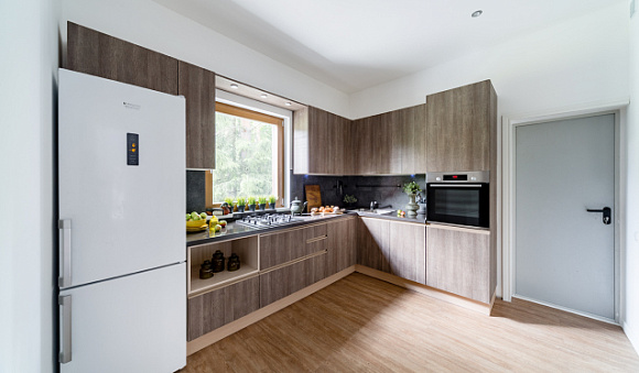 Компания «Кухонный двор» выпускает кухни в коричневом цвете из натурального массива дерева и качественного МДФ. Для производства рабочих поверхностей применяется керамика, камень, высокопрочный пластик.