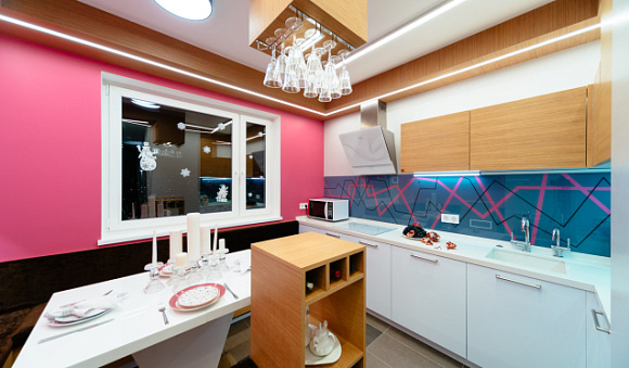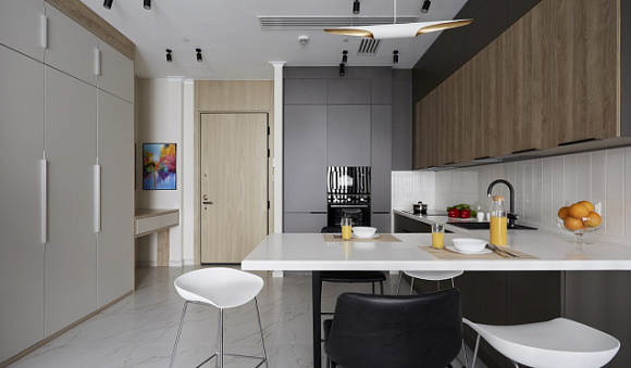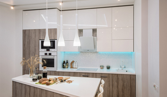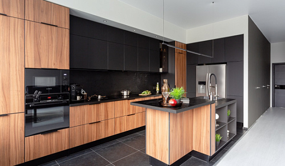 • Широкий ассортимент. Планировка комплекта может быть линейной, П-образной, островной, угловой. Интересно выглядят модели с барными стойками.
