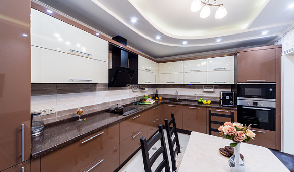 • Эстетичность. Кухни коричневого цвета выглядят очень привлекательно как в однотонном, так и комбинированном исполнении. При желании фасады подобных комплектов можно декорировать решетками, молдингами, резьбой и вставками.