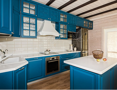Современная кухня на даче также уместна. Разнообразие материалов позволяет выбрать любое цветовое решение. В каталоге представлено более 500 оттенков, среди которых можно подобрать как светлые фасады, так и темные.