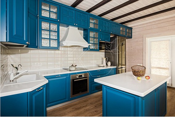 Современная кухня на даче также уместна. Разнообразие материалов позволяет выбрать любое цветовое решение. В каталоге представлено более 500 оттенков, среди которых можно подобрать как светлые фасады, так и темные.