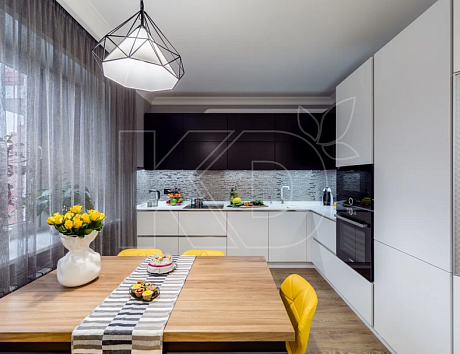 Черно-белая кухня в классическом исполнении выглядит элегантно. Однако принт с цветами сделает мебель более эффектной. При этом грамотное сочетание оттенков создаст гармоничное восприятие и визуально преобразит кухонное пространство. Для стилевого созвучия допустимо также подобрать стол с идентичным рисунком.