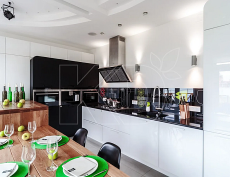 Сегодня популярностью пользуются кухни с фотопечатью. Благодаря современным технологиям возможно использовать печать различных изображений и для оформления мебели, и для декора фартука. Можно выбрать принт абсолютно любой тематики: флористический, анималистический, в виде натюрмортов, репродукций картин, орнамента. Выполненные в стиле модерн черно-белые кухни в цветах смотрятся особенно эффектно.