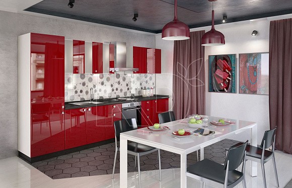 Гарнитур прямой формы трехметровой длины отличается удобством эксплуатации. Для более рационального использования пространства подобная модель может иметь многоярусные навесные шкафы, в которых без труда уместится вся кухонная утварь. Также кухонный комплект можно оснастить высоким пеналом с большим количеством полок и ящиков.