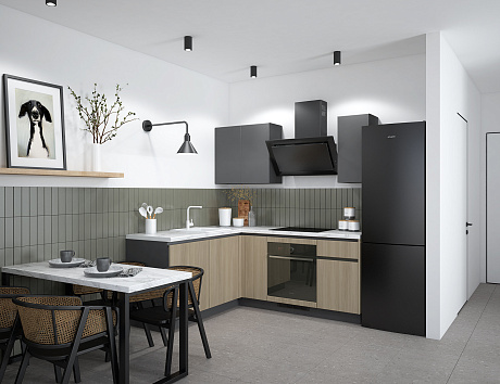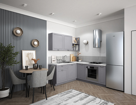 Вдохновлена роскошью, исполнена в минимализме. Кухня-сет Уна — готовое решение для тех, у кого нет времени на индивидуальный проект. Компактная L-образная планировка гарантирует 100% удобство в использовании, а сочетание лаконичных фасадов и строгих акцентов задаёт современный настрой всему интерьеру. Строгий дизайн, продуманные детали и удобные системы хранения делают эту кухню идеальным выбором для тех, кто превыше всего ценит комфорт и эстетику.