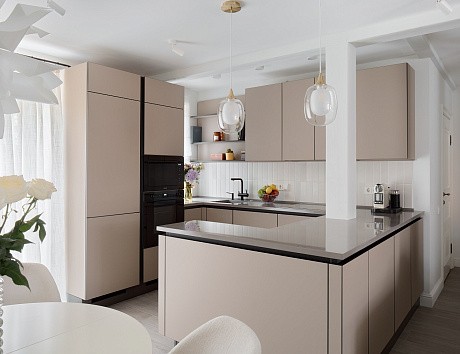 Г-образные кухни особенно хорошо подходят семьям, в которых традиционно готовкой любят заниматься несколько человек одновременно. Также такие кухни дают возможность установить дополнительную рабочую поверхность, например, барную стойку или компактный обеденный стол. Как итог, пространство становится более универсальным.