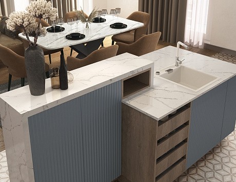 Эстетика — не единственный бонус острова. Он выступает в роли логичной линии зонирования, отделяя зону кухни от гостиной. Важно, чтобы вокруг острова оставалось достаточно места для свободного перемещения — минимум 90 см. Также заранее определите, какие функции будут интегрированы в остров: варочная панель, мойка, духовой шкаф и т.д., чтобы подвести к нему коммуникации и электрику.