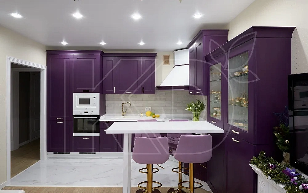 Планировка, при которой модули располагаются в виде буквы «П» вдоль трех смежных стен, обычно используется в больших помещениях. Подобное расположение считается одним из наиболее эргономичных, потому что позволяет придерживаться принципа рабочего треугольника. Холодильник, плита и мойка размещаются на одинаковом друг от друга расстоянии.