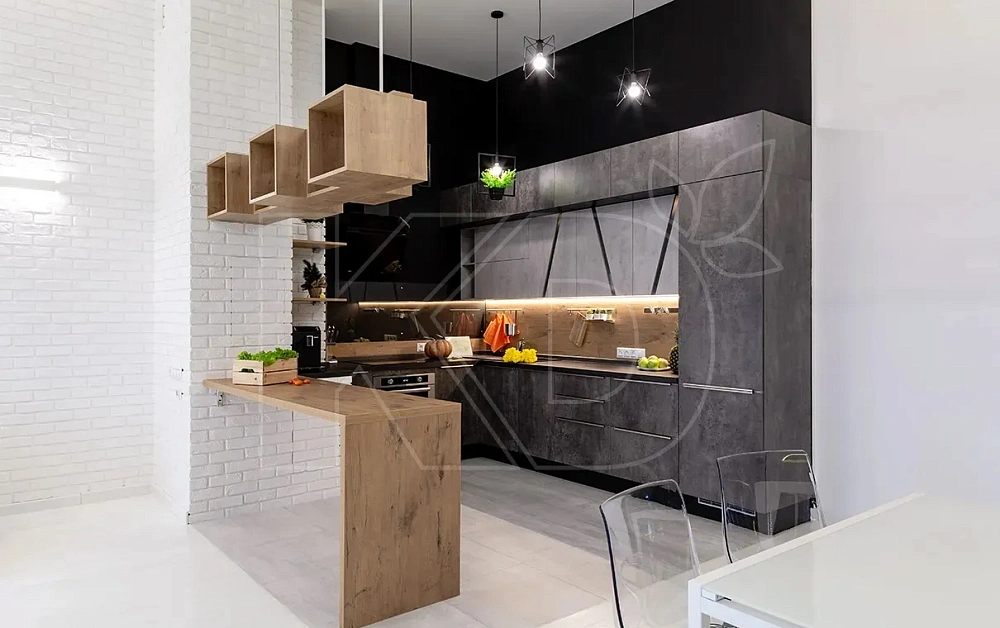 Барная стойка может использоваться в качестве дополнительной рабочей поверхности или обеденного стола. Другой плюс такой конструкции заключается в том, что она может использоваться для зонирования пространства.