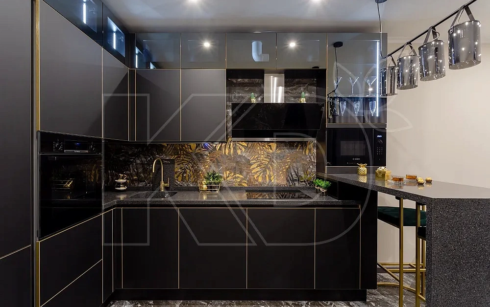 Г-образная планировка кухни обеспечивает комфортное для работы пространство. При такой форме лита, раковина и все нужные шкафы находятся под рукой.