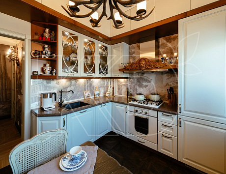 Если на вашей кухне есть открытые полки, на них можно разместить небольшое количество декора. Пусть это будут стильные статуэтки, рамки с памятными фотографиями или баночки со специями. Но не стоит увлекаться. Предметов интерьера не должно быть много, они должны свободно стоять на полке и быть выполнены в едином стиле.