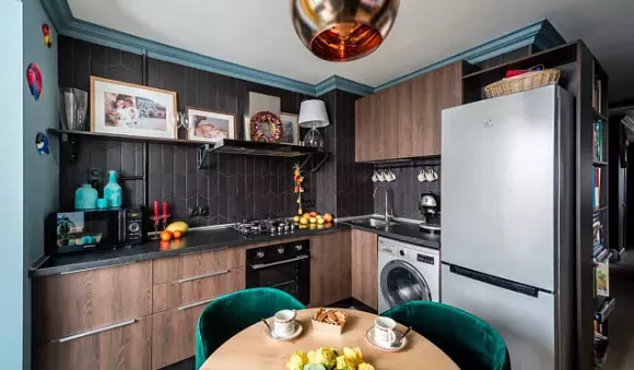 С черным цветом можно сочетать контрастные цвета, которые будут выбиваться из общего фона, делая кухню интереснее. Это могут быть яркие желтые, зеленые или оранжевые оттенки. Также можно добавить дерево.