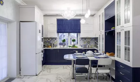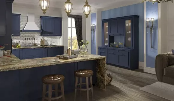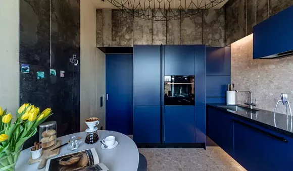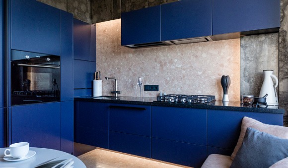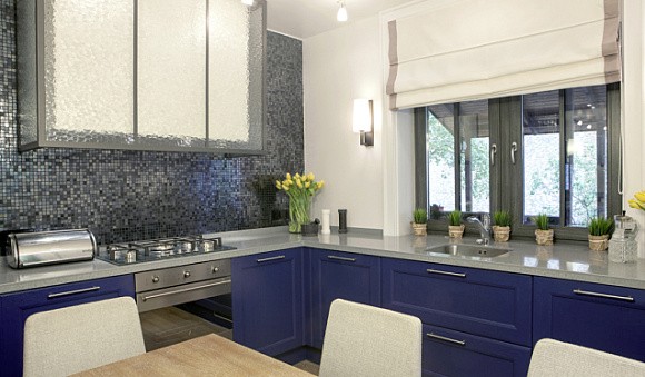 Кухонная мебель синих оттенков, дополненный серыми акцентами, притягивает внимание, а пол можно выполнить в любом приглушенном цвете. Если кухня маленькая, то ее стоит разбавить белым цветом.