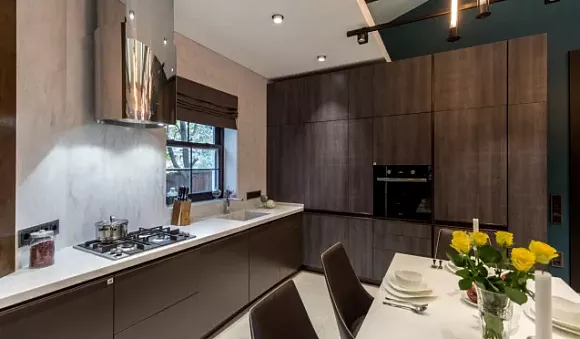 На угловых кухнях больше места, но и стоят они дороже. Есть один нюанс. Угловые кухни темного цвета лучше не использовать в вытянутых пространствах. Подобное решение окажется неудачным: находиться на кухне нескольким членам семьи будет неудобно.