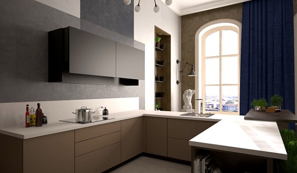 К полностью серой кухне можно сделать белые стены, но кухня всё еще останется темной, если все остальные детали будут выполнены в таких же серых тонах.