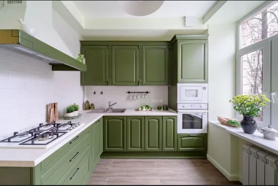 Для стен угловой кухни обычно выбирают приглушенные оттенки зеленого, но, если пространство слишком маленькое, визуально расширить и сделать помещение светлее поможет сочетание белых стен и светло-зеленой мебели насыщенного оттенка.