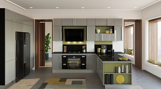 Владельцам больших, объединенных с гостиной кухонь или квартир-студий подойдут кухни П-образной формы, а также модели с полуостровом или гарнитуры с барной стойкой. Такая кухня обладает теми же достоинствами, что и угловой вариант, и при этом за счет дополнительной третьей стороны (полуострова или барной стойки) естественным образом обозначает границы, отделяя жилую зону от кухонной.