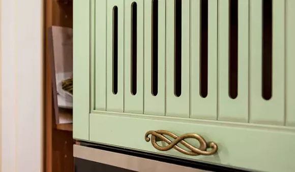 Классическая кухня зеленого цвета отличается строгими линиями, выверенной симметрией. Декорировать подобный комплект можно резьбой, позолоченными деталями, патиной.