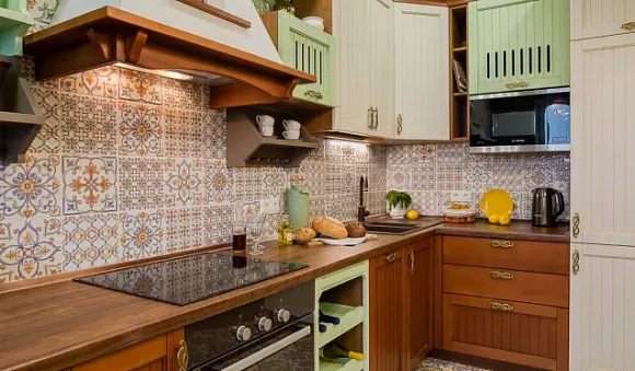 Модель в стиле кантри преобразят деревянные решетки, растительные узоры или стеклянные вставки. При выборе кухонной мебели в деревенском стиле, учитывайте, что она должна быть в самых теплых оттенках зеленого – оливковом, желтовато-зеленом или хвойном.