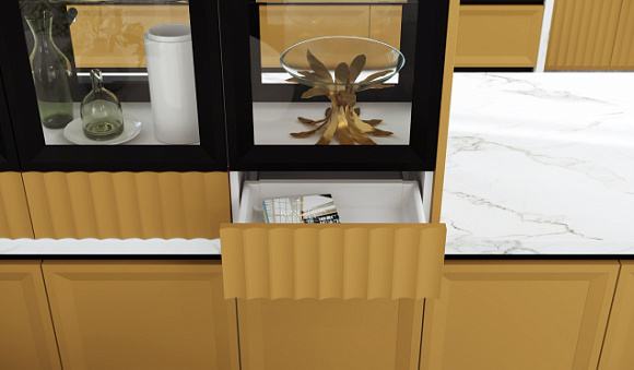 Разные текстуры. Кухня в желтом цвете хорошо смотрится с матовыми и глянцевыми фасадами.