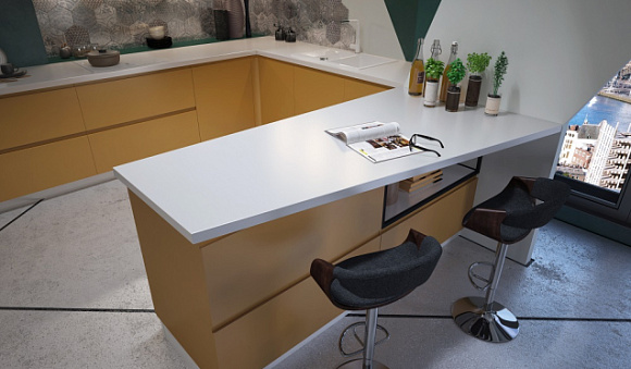 Островной кухонный гарнитур желтого цвета – идеальное решение для квартиры-студии. С его помощью можно визуально отделить обеденную часть от гостиной. Также остров используют для установки плиты или мойки, если позволяют коммуникации.