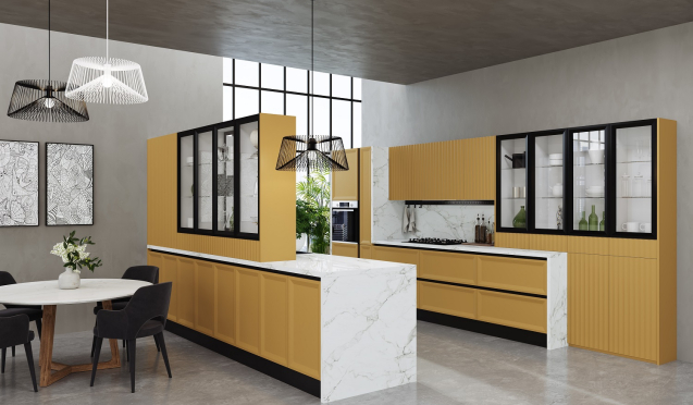 Компания «Кухонный двор» производит комплекты из качественного МДФ и натуральной древесины массива дерева. Здесь вы сможете приобрести кухонный гарнитур желтого цвета любой планировки. К преимуществам сотрудничества с нами можно отнести следующее: