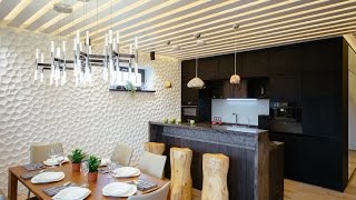 Фасады модели выполнены из так называемых экомассива шоколадного, почти черного цвета. Экомассив — это новое поколение современных, экологически чистых конструкционно-отделочных материалов, получаемых особым способом прессования слоистых пластиков на древесные плиты (ДСП, MDF). Материал сочетает в себе пластик и древесную основу. Он влагостойкий, не деформируется со временем и очень практичен. Плиты выполнены с глубоким тиснением, как у ценных пород древесины — бука или дуба — прикасаться к такой поверхности одно удовольствие. На фоне светлой отделки стены темные фасады кухонного гарнитура, остров и барная стойка смотрятся весьма эффектно.