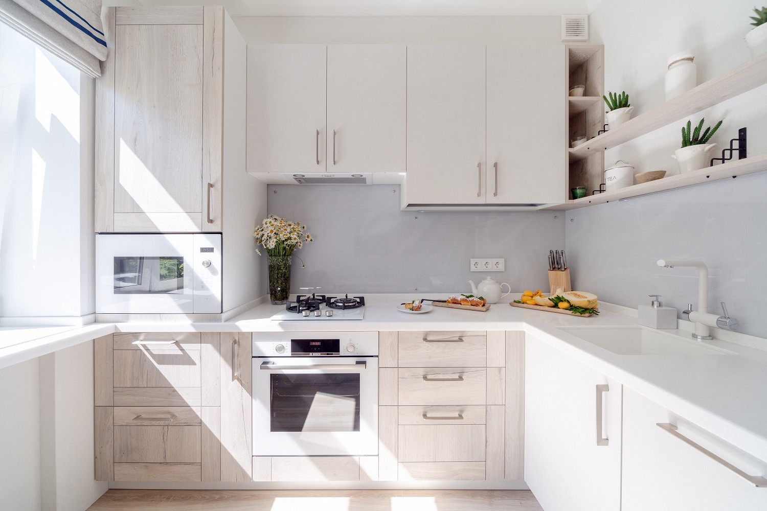 Секрет очарования здесь, прежде всего, в цветах и материалах. «Стоун Фрэйм» словно изнутри сияет белизной, а все фасады здесь выполнены из немецкой экоплиты Egger. Поверхности разные: одни имитируют древесину, другие бетон. Такое сочетание оттенков и фактур делает кухню удивительно нежной. А еще визуально расширяет окружающее пространство!