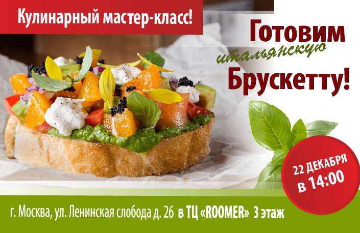 Шеф-повар раскроет свои профессиональные секреты, предложит вам принять участие в процессе приготовления блюда и, конечно же, продегустировать вкуснейшие брускетты!