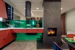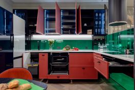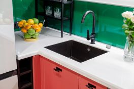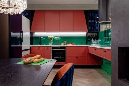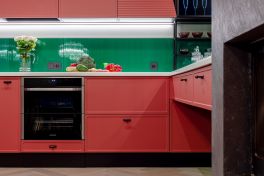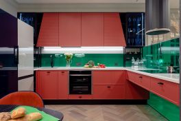 Шелковистые коралловые фасады с покрытием «Regen Skin», вытяжка в форме древнегреческой колонны, фартук и перегородка из зеленого триплекса, белая фактурная столешница из искусственного камня – всё буквально дышит энергетикой морского побережья! Раньше здесь стояла кухня, которая была почти втрое меньше. «Джейн» расширила пространство и сделала его максимально дружелюбным по отношению к хозяйке!