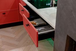 Нежный коралловый цвет очень идёт фасадам. Они, к слову, имеют разную фрезеровку – «рамочную» и «волнистую». Разнообразие форм не даёт глазу заскучать, поднимает настроение и пробуждает аппетит! А лаконичные вертикальные ручки и зоны с тонированным стеклом вносят едва уловимые нотки строгости. Эта «Джейн» беззаботна, но отнюдь не наивна! Интерьеры с ней в равной мере уютны и элегантны.